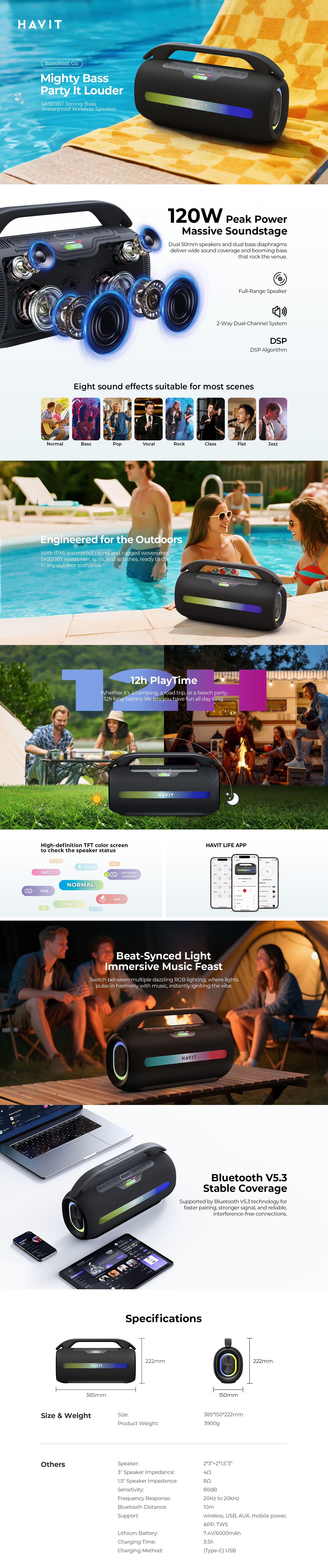 Портативна колонка HAVIT SK920BT 60W IPX6 має велику потужність 60W (при цьому пікова становить 120W), завдяки чому видає гучний та об'ємний звук. Оснащена чотирма динаміками розміром 3", які мають опір 4 Ом, та двома динаміками розміром 1.5" із опором 8 Ом.